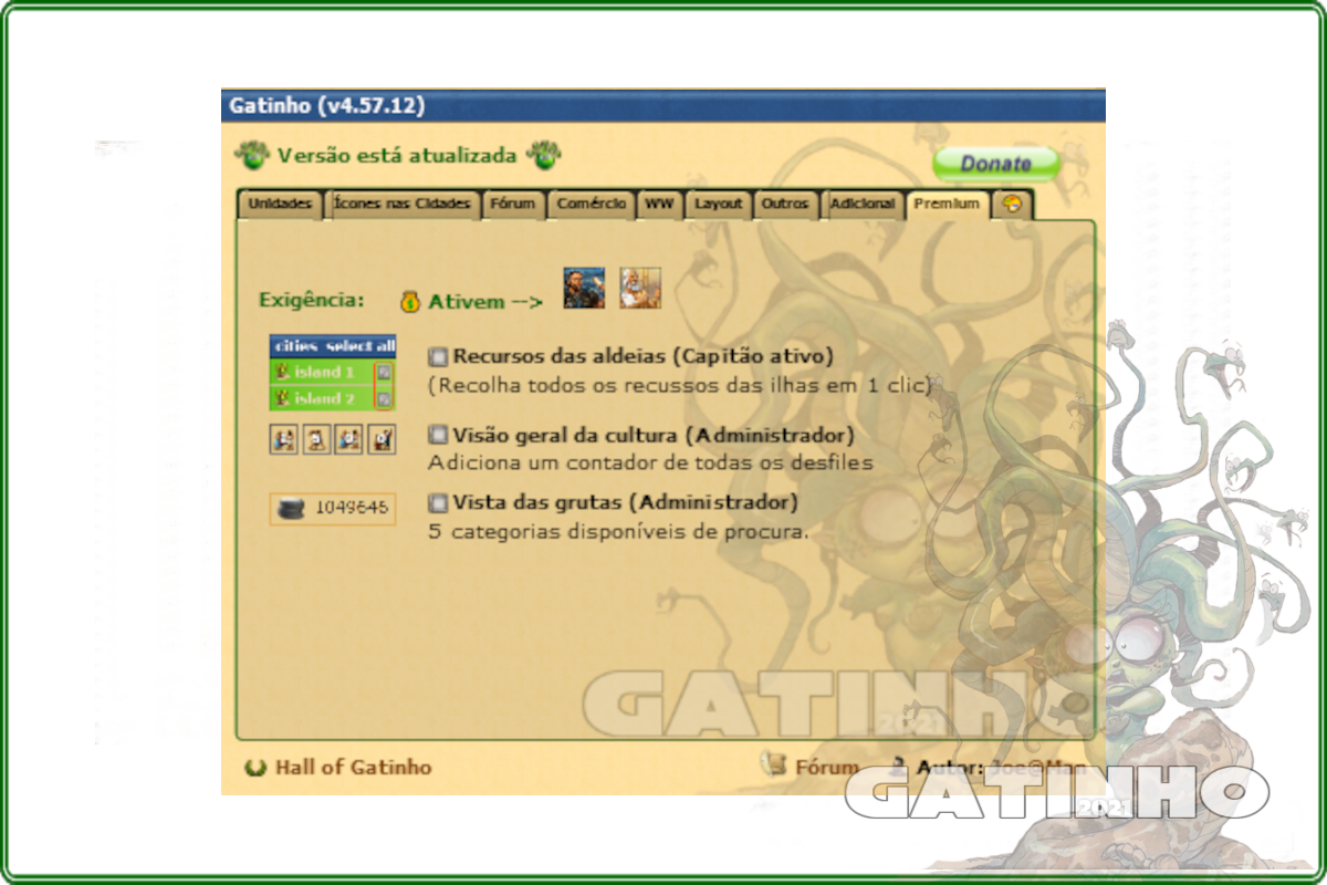 After opening the Settings page "Joe-Gatinho", this is done with the Do Kitty button on the right sidebar of the main page of the game, we verify the existence of 9 different tabs, each of which provide several modules that can be activated or deactivated. according to your need. The "Premium" tab is made up of (3) modules, and we are going to talk about them here.